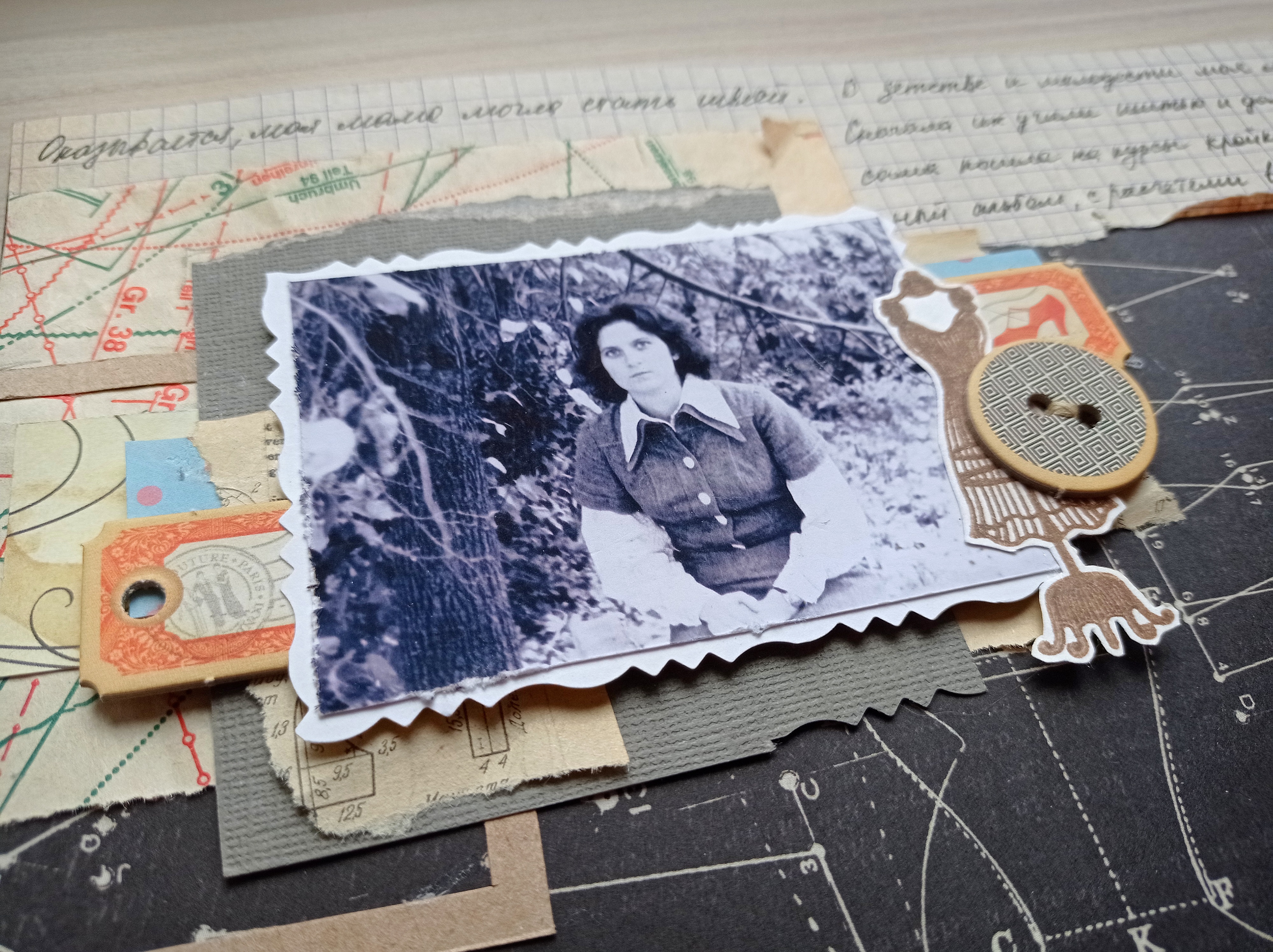 Она посвящена моей маме, ее выбору профессии. Я использовала в работе старые выкройки, листочки из советских отрывных календарей с описанием моделей для шитья, листы старых выцветших школьных тетрадей. Из специальных скраповых материалов - картонная вырубка от Графики 45, отштамповка манекена и ножи от MimiCut. Поскольку мне на страничке очень в тему был журналинг, скетч я немного доработала и на тетрадных листах добавила необходимый текст.